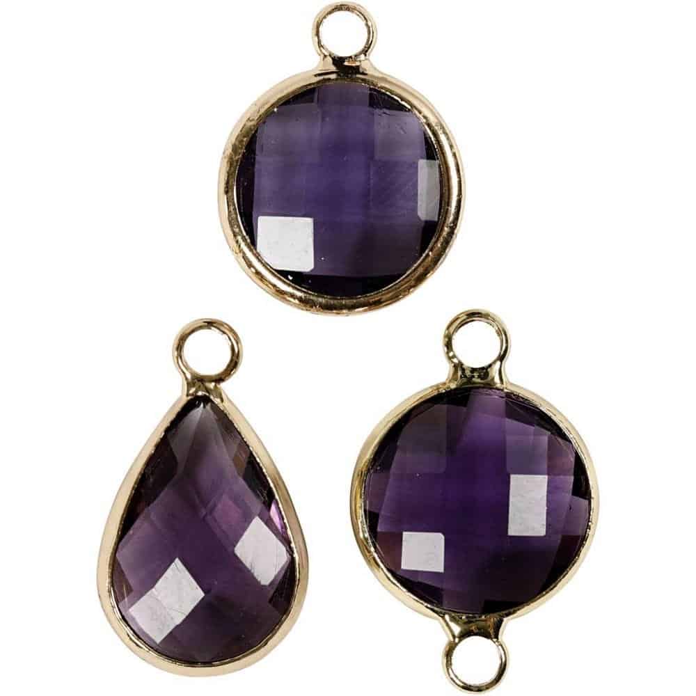 Sieradenhanger met cabochon van transparant facet glas en metalen kast met oog. Afmetingen 15mm tot 20mm, 2mm gatgrootte. Geleverd per 6 stuks in 3 designs. Verkrijgbaar in verschillende trendy kleuren.